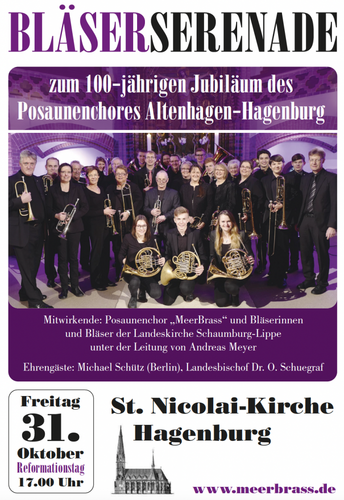 Am Freitag, den 31. Oktober (Reformationstag), findet um 17 Uhr eine festliche Serenade mit Gästen in der St. Nicolai Kirche Altenhagen-Hagenburg statt. Am Samstag, den 01. November, folgt ein Workshop mit dem bekannten Komponisten Michael Schütz aus Berlin im Ratsgymnasium Stadthagen.