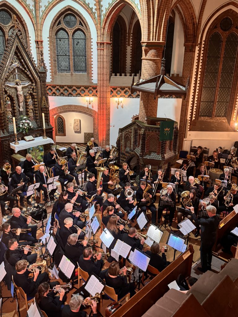 Ein besonderer Höhepunkt war das Stück „Frage und Antwort“ von Michael Schütz, bei dem der Komponist selbst an der Orgel saß und mit den Bläserinnen und Bläsern musizierte. Dieses mitreißende Zusammenspiel von Orgel und Bläsern berührte das Publikum sichtlich. Den festlichen Abschluss bildete das gemeinsam gespielte „Dona nobis pacem“ von Traugott Fünfgeld, ein eindringlicher Kanon, der die Botschaft von Frieden und Hoffnung in den Kirchenraum trug.